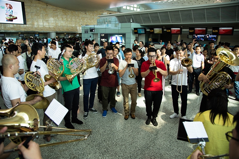 2018年7月13日,由航站區管理中心聯合杭州愛樂樂團共同舉辦的“交響樂快閃”文化活動在T3航站樓出發大廳傾情上演。下午14點,一聲清脆的小號聲拉開了活動的序幕,在人流如織的航站樓內,年輕的樂手們為旅客帶來了一場前所未有的視聽享受——小號、圓號、長號、大管、雙簧管等樂器一應俱全,樂手們用自己嫻熟的技巧演奏了的《茉莉花》、《失戀陣線聯盟》、《打字機》等經典名曲,成功引來過往旅客的駐足觀看,旅客們紛紛拿出手機拍照留戀。不少人更是陸續加入的表演活動中,令“交響樂快閃”活動現場變得人山人海、熱鬧非凡。(航站區中心 王源斌 朱偉)